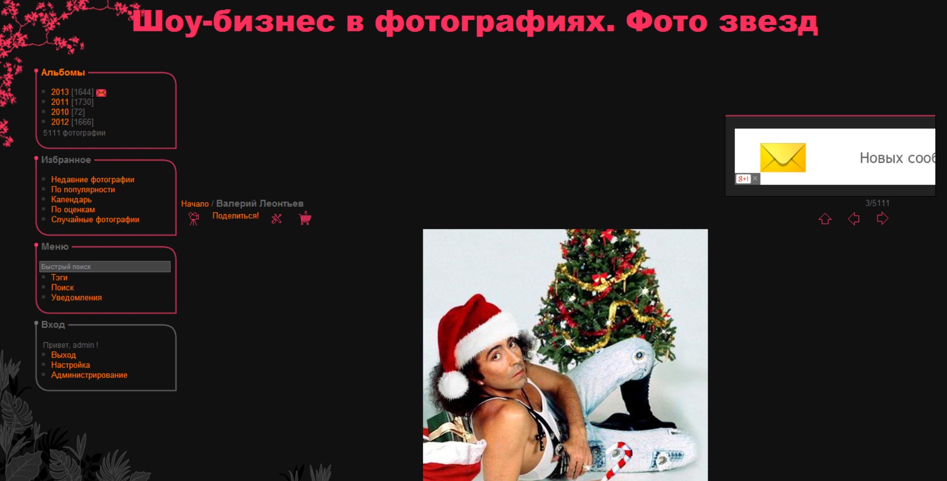 Создана как база фотографий шоу-бизнеса из разных источников. Представляет собой галерею с удобным тегированием и поиском. Не интернет-магазин. Снабжена защитой от спама, масштабируется до полноценного фотохостинга. Имеет систему извлечения EXIF информации из фото (выдержку, диафрагму, оригинальный размер, автора, описание и т.д.). Опционально снабжен слайд-проекцией и корзиной.